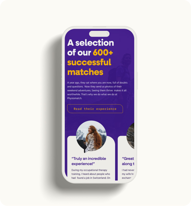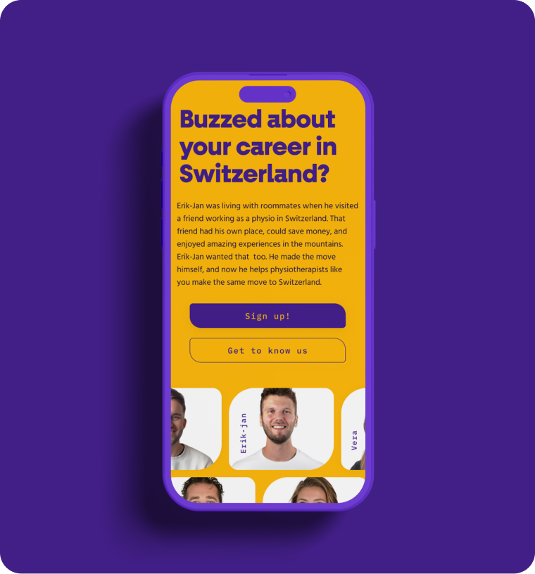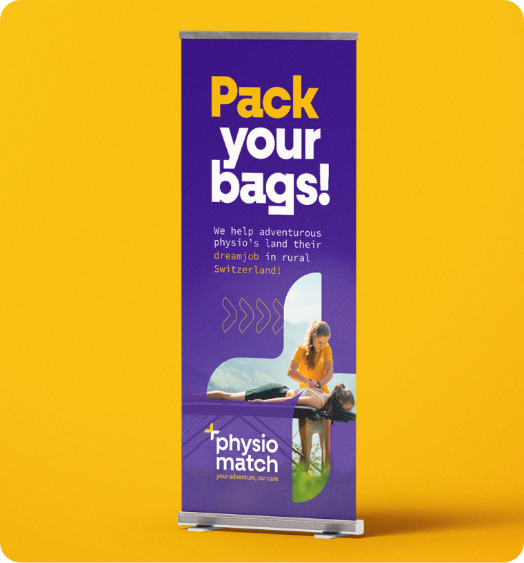 Physiomatch helpt Europese fyiotherapeuten aan hun droombaan in Zwitserland. Daar zijn ze zo bedreven in, dat ze inmiddels meer dan 600 fysio’s hebben geplaatst in het prachtige, ruige Zwitserland. Hoewel ze dus al succesvol zijn, voelde het voor Physiomatch als een goed moment om hun positionering onder de loep te nemen. Met hulp van stratege Karina Zuiderveen kwam naar voren dat het ontzorgen van het emigratie-avontuur de grootste kracht is van Physiomatch. “Your adventure, our care.” vat dit perfect samen. Mijn handen jeukten om deze propositie tot leven te brengen. Eerlijk is eerlijk, het werken aan dit project heeft me wel een klein beetje doen twijfelen of ik me zou omscholen tot fysiotherapeut.